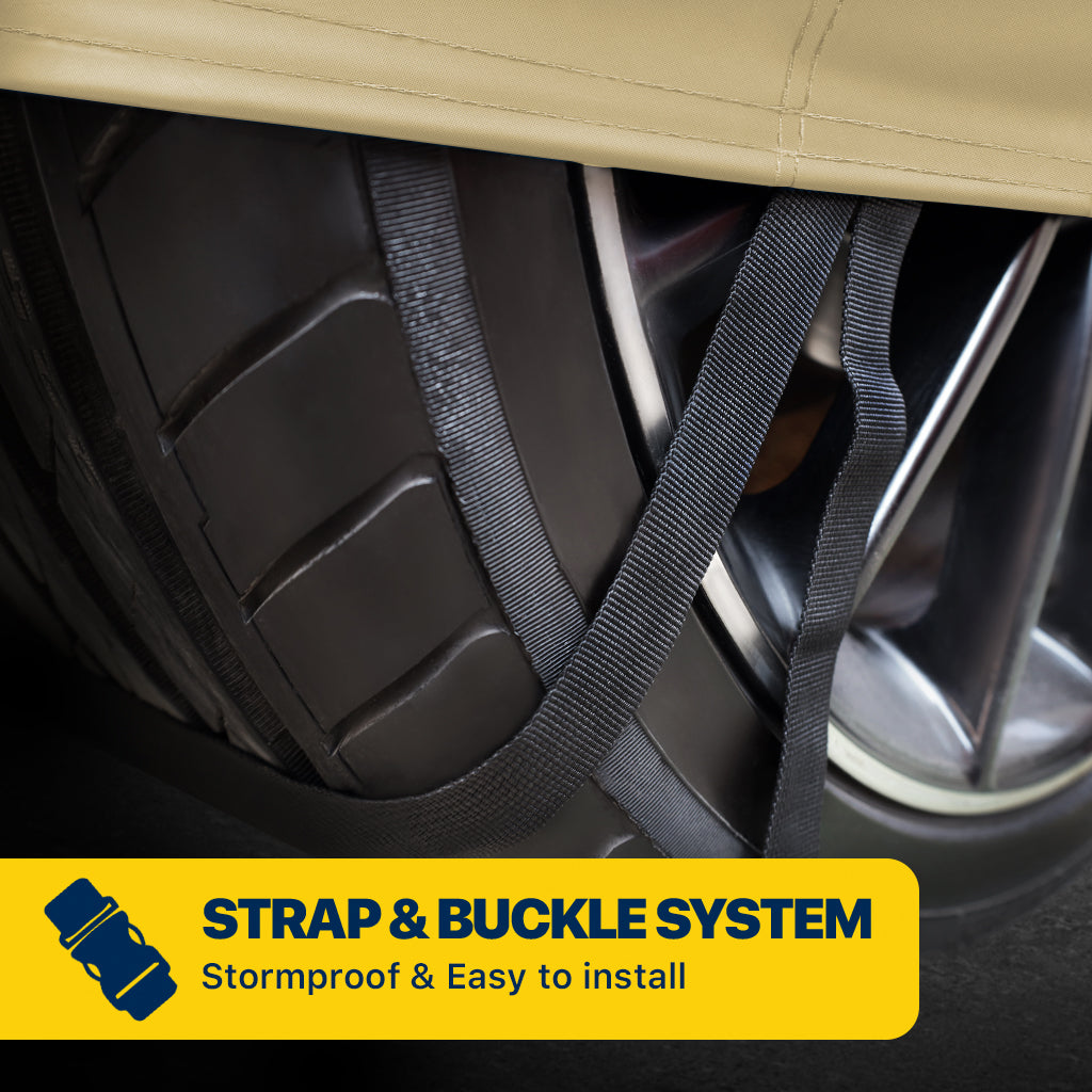 Made with premium waterproof fabric to keep your car dry and fully protected in extreme weather. Built to block rain, snow, and sun, this cover keeps your car dry and safe in any weather.