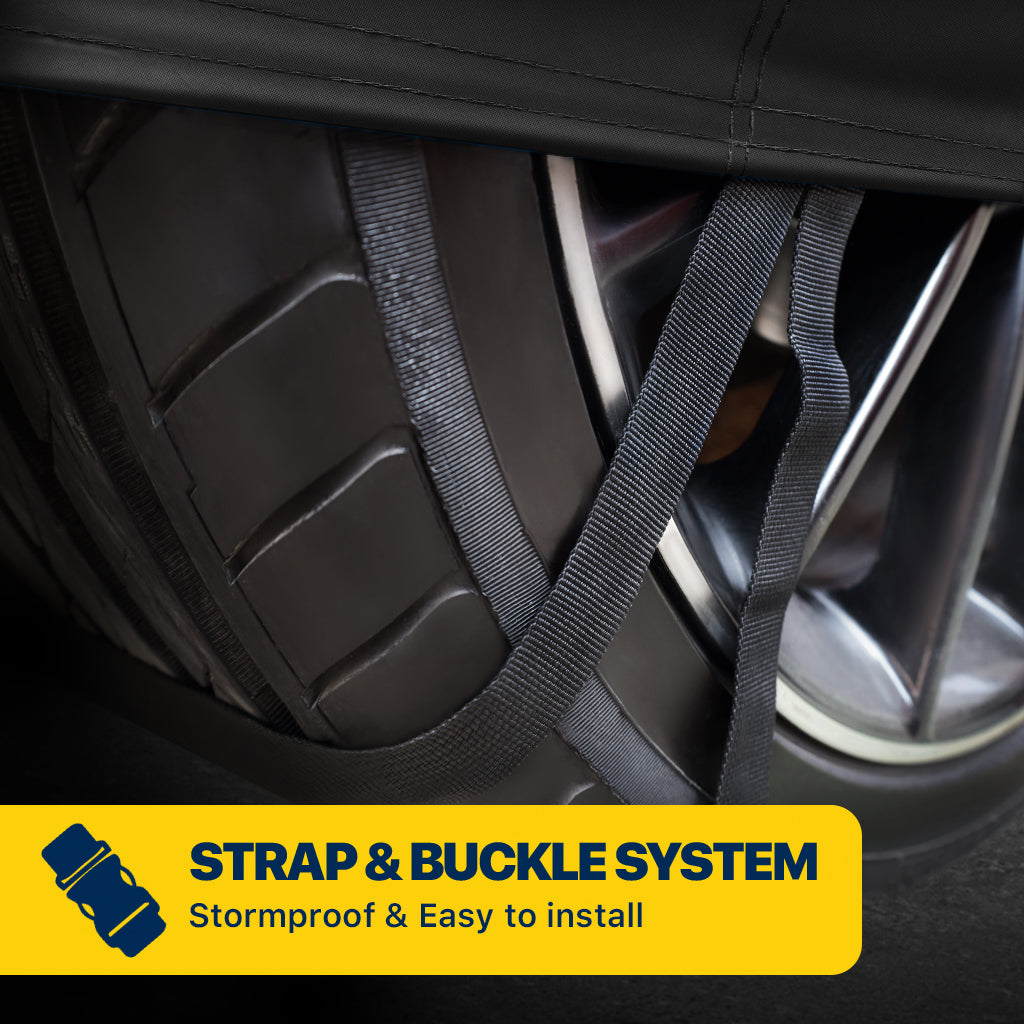 Made with premium waterproof fabric to keep your car dry and fully protected in extreme weather. Built to block rain, snow, and sun, this cover keeps your car dry and safe in any weather.