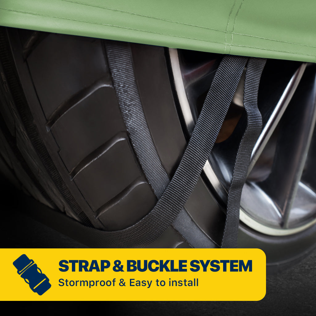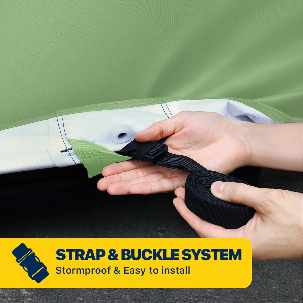 Heavy-duty straps and buckles keep the cover locked in place even in strong winds and storms.